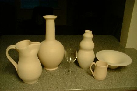Each time he inspires me to do better. The photo below shows a few of the pots I created at the workshop. (The wine glass is there to show comparative size.) I am particularly proud of the tall vase and the picher. Without Claudio's inspiration I doubt that I would have even attempted them.